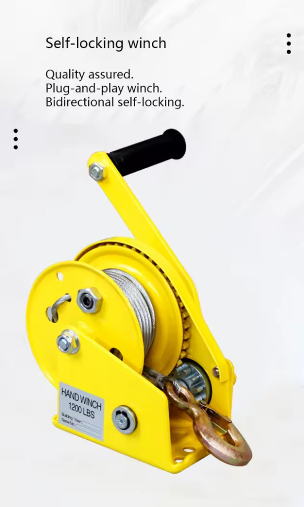Tartozék: Önzáró kézi csörlő acélsodronnyal és kampóval.